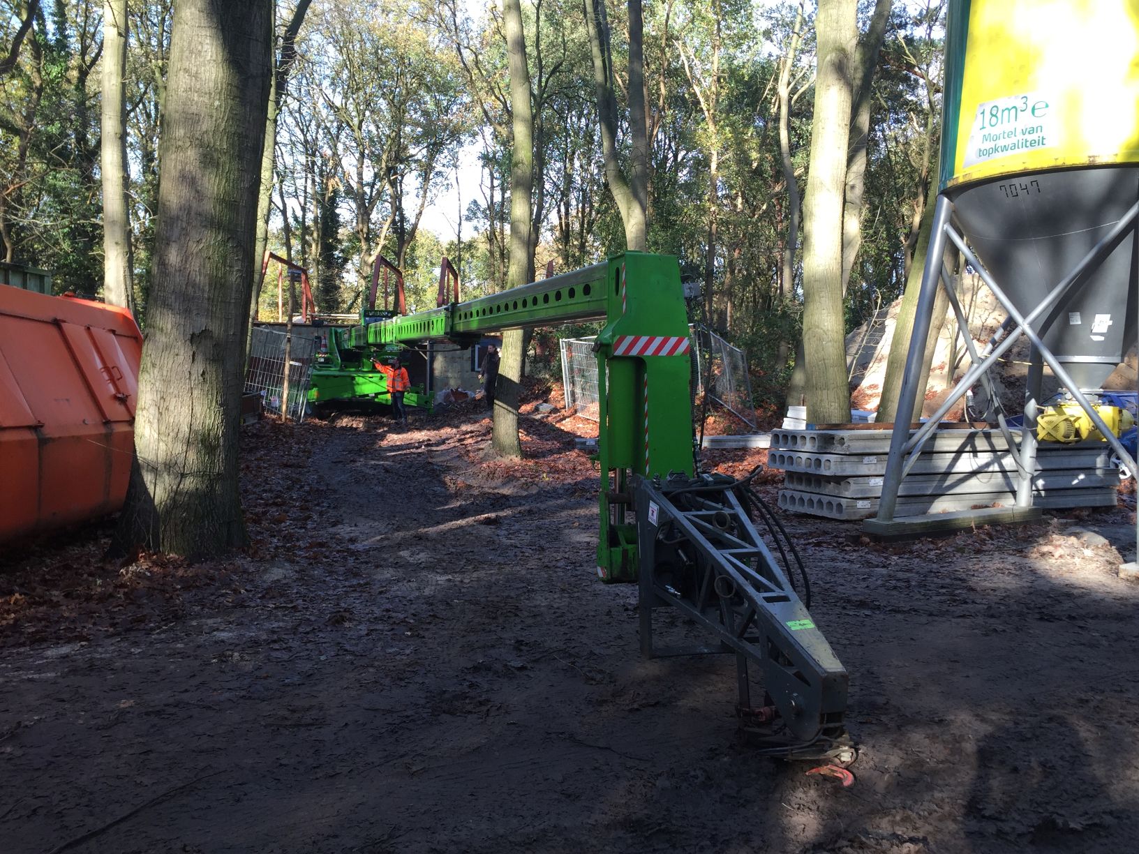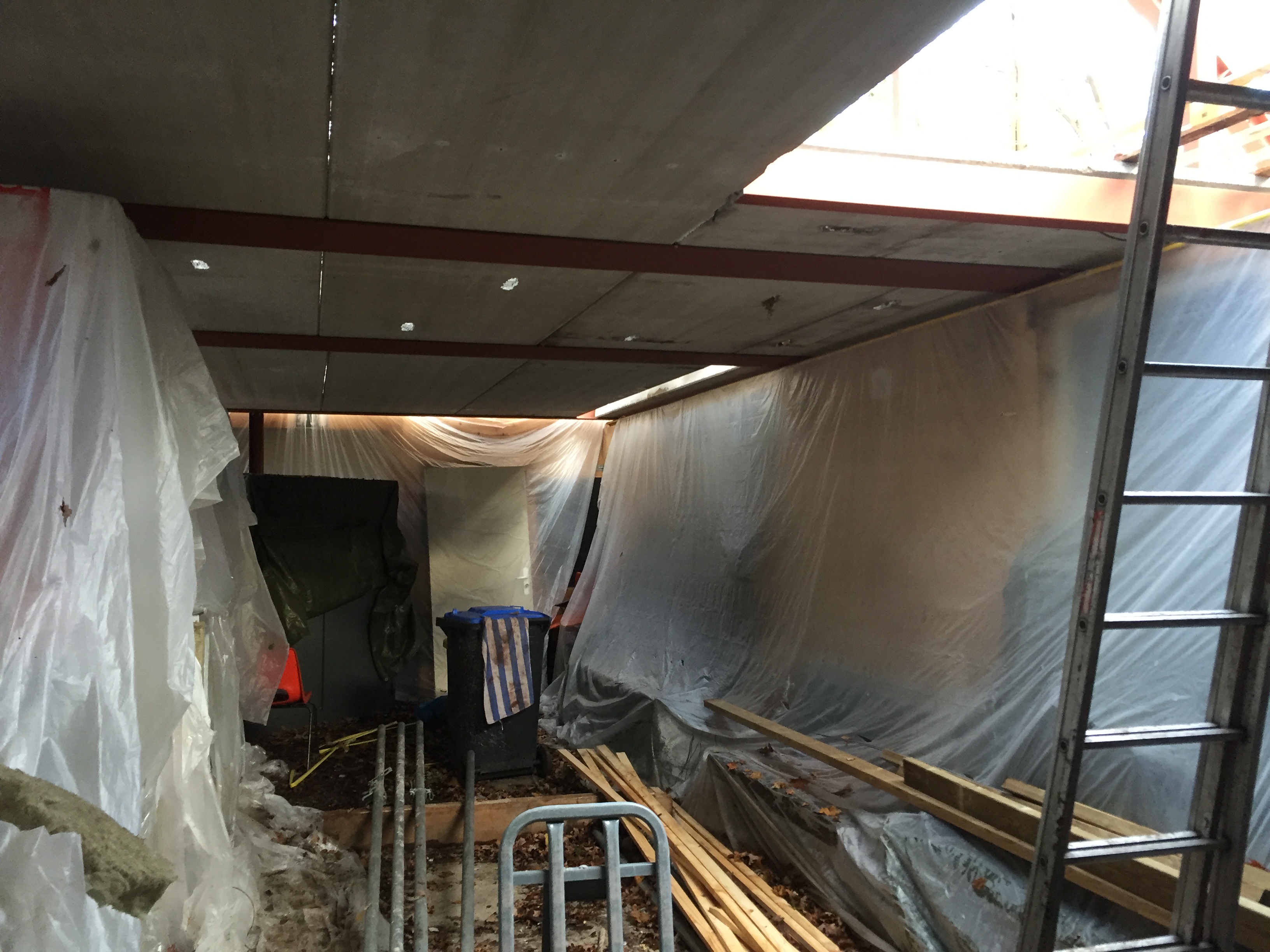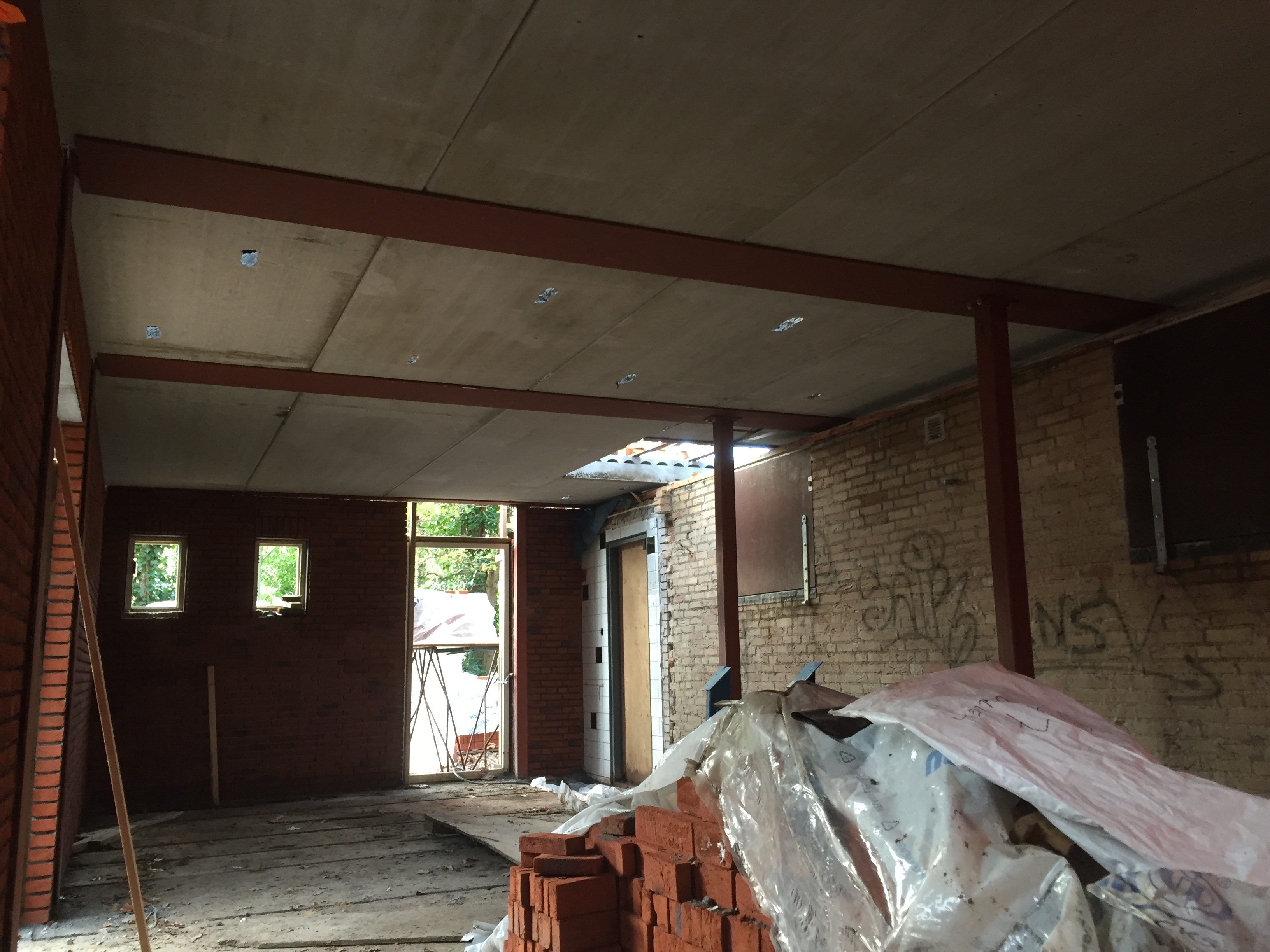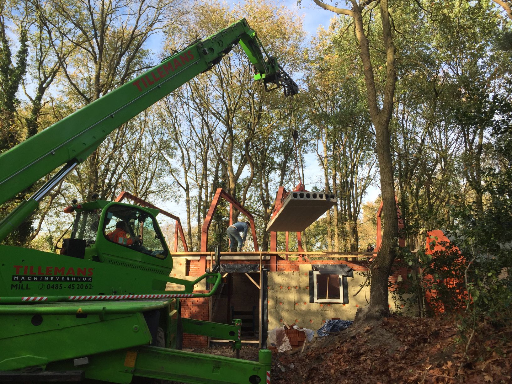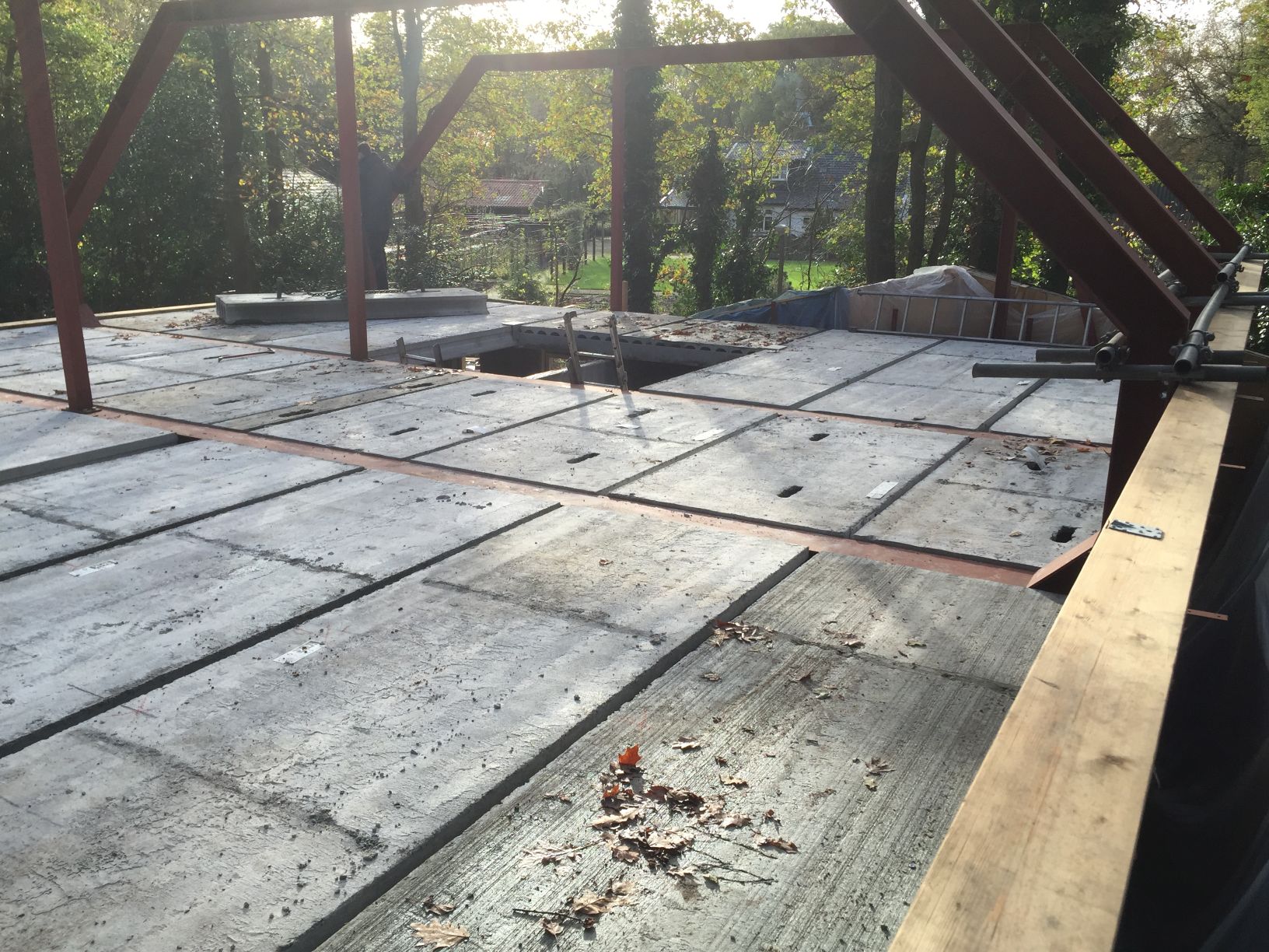 Foto's van het plaatsen van de verdiepingsvloer.
